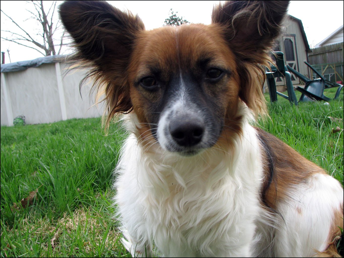 Luke is the brown and white male. He is half Papillon and half Rat Terrier. The breeder said they share the same grandma. I named him after two pop culture icons – Marvel’s Luke Cage and General Hospital’s Luke Spencer. He seemed rather fearless when we first got him. He was also a little bigger than all the other pups & was very boisterous knocking all the others down as he jumped up and down trying to get our attention in the tiny pin they were all in.
