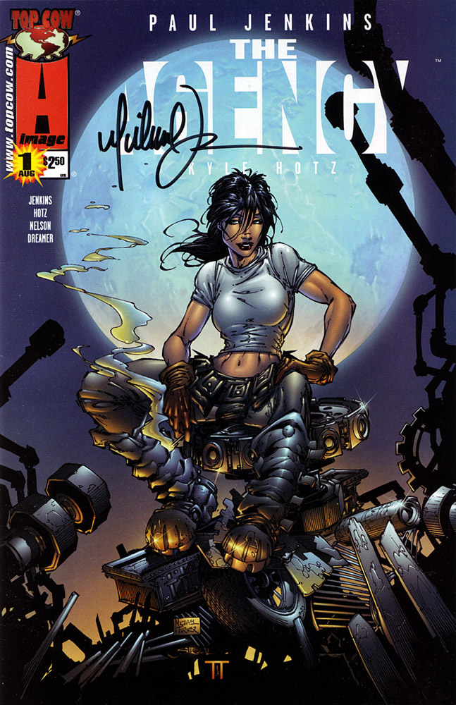 CBR and Blog@Newsarama are reporting that celebrated comic artist and all around great guy Michael Turner has passed away. He was 37 and had long battled cancer. I am so glad I got a chance to briefly meet/talk to him at Wizard World Chicago in 2005. He was actually leaving by the time I got to the Aspen booth. It wasn’t even an official autograph session. But I sort of hollered at him, got his attention and he graciously signed a copy of this Agency cover (click the thumbnail for larger). From my own very limited experience as well as all the accounts I’ve read, Michael Turner was one of the Good Guys and he will be greatly missed. Those wishing to donate are encouraged to use Michael’s favorite charities: