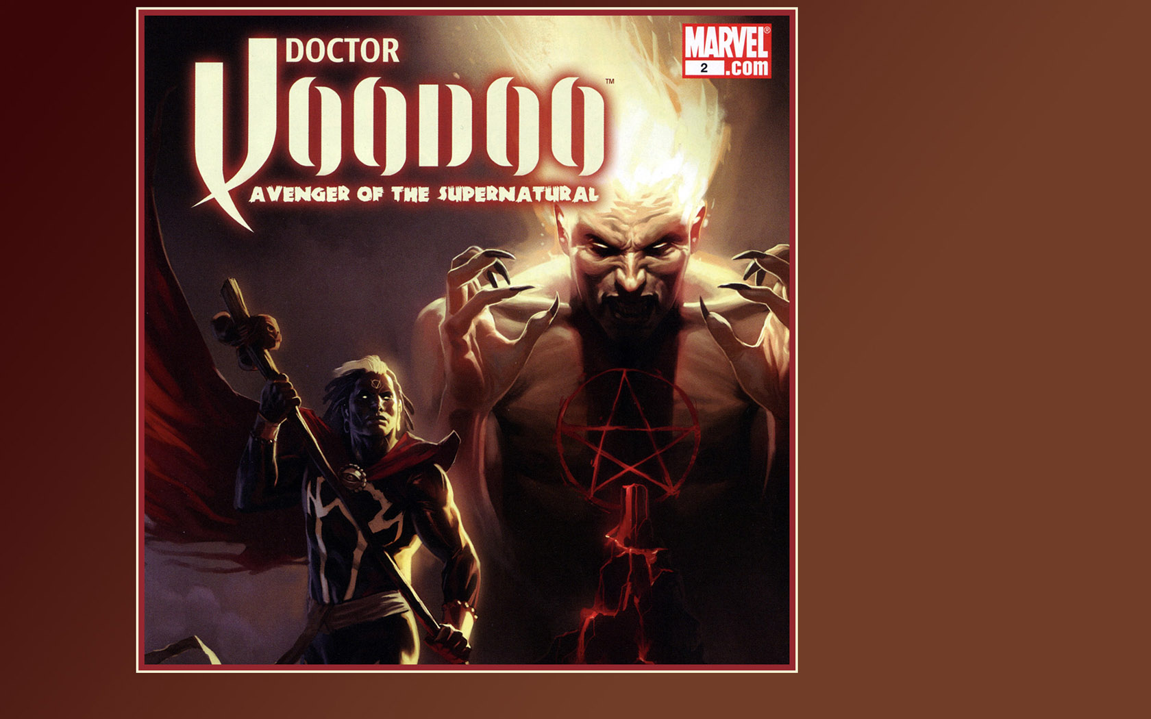 Brian Michael Bendis modernized the character somewhat recently in the pages of New Avengers. Jericho Drumm got promoted to Doctor Voodoo (oddly enough that is what Roy Thomas originally called the character when he brought the concept to Stan Lee but Stan said no -BROTHER VOODOO!). According to Bendis’s story Dr. Strange “fell from grace” and the Eye of Agammato had to choose a new Sorcerer Supreme. After a lot of flying around looking at possible candidates (including among others Dr. Doom and Daimon Hellstrom the Son of Satan) Jericho Drumm was chosen. So he got a cool amulet, scarlet cloak of levitation, a black body suit and a creepy staff with attached dangling shrunken heads to go along with the upgraded nomenclature. Speaking of the creepy staff -get this -the heads SCREAM crazy unpronounceable stuff at his opponents when he uses it’s dark mojo! Awesome! 🙂