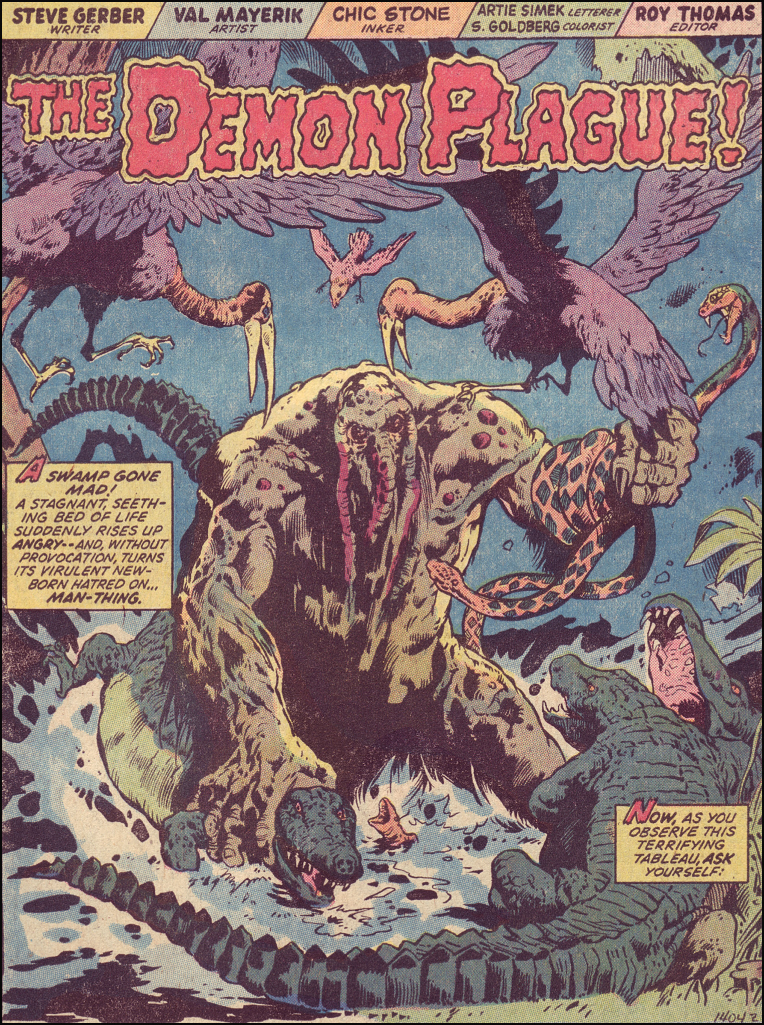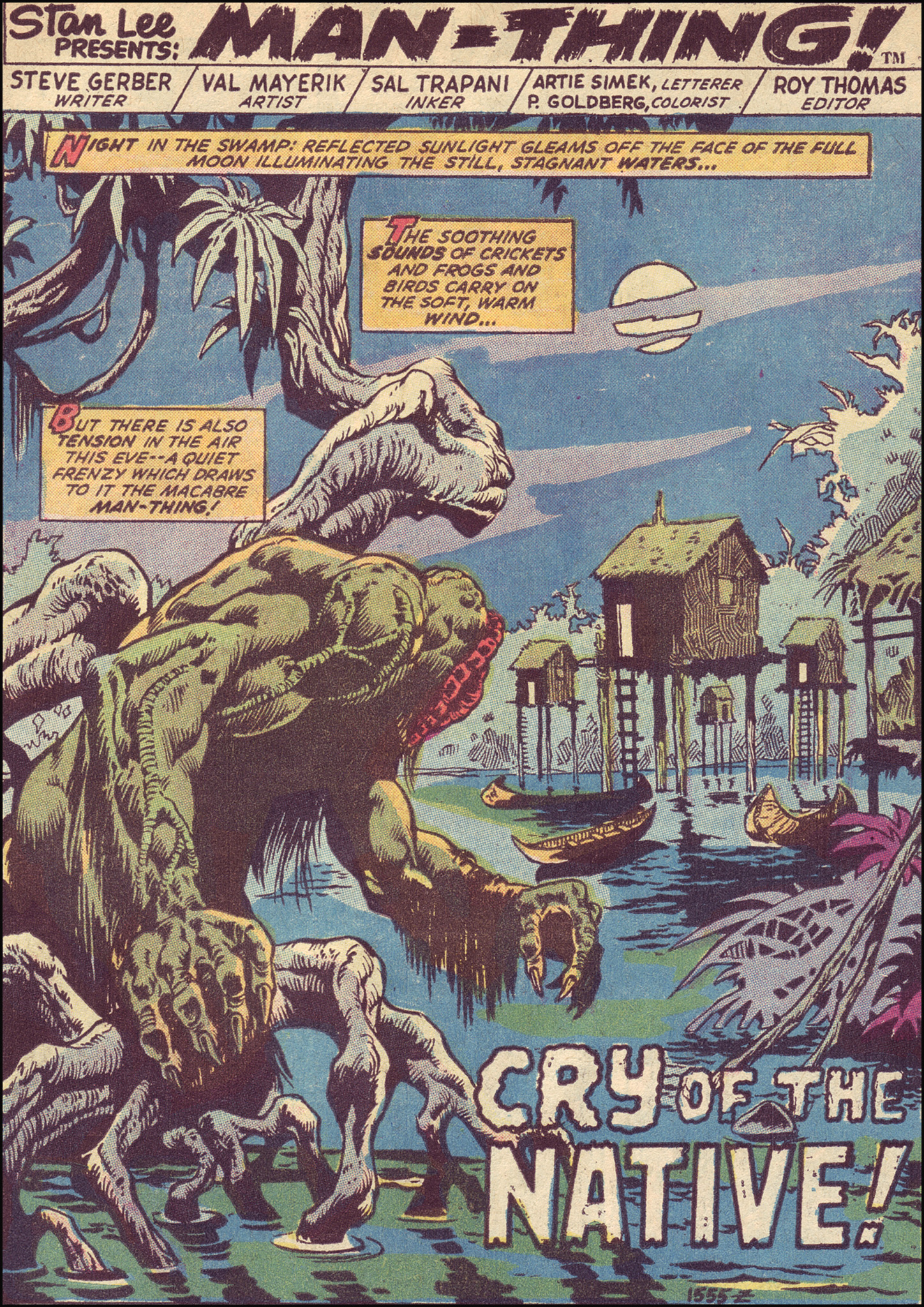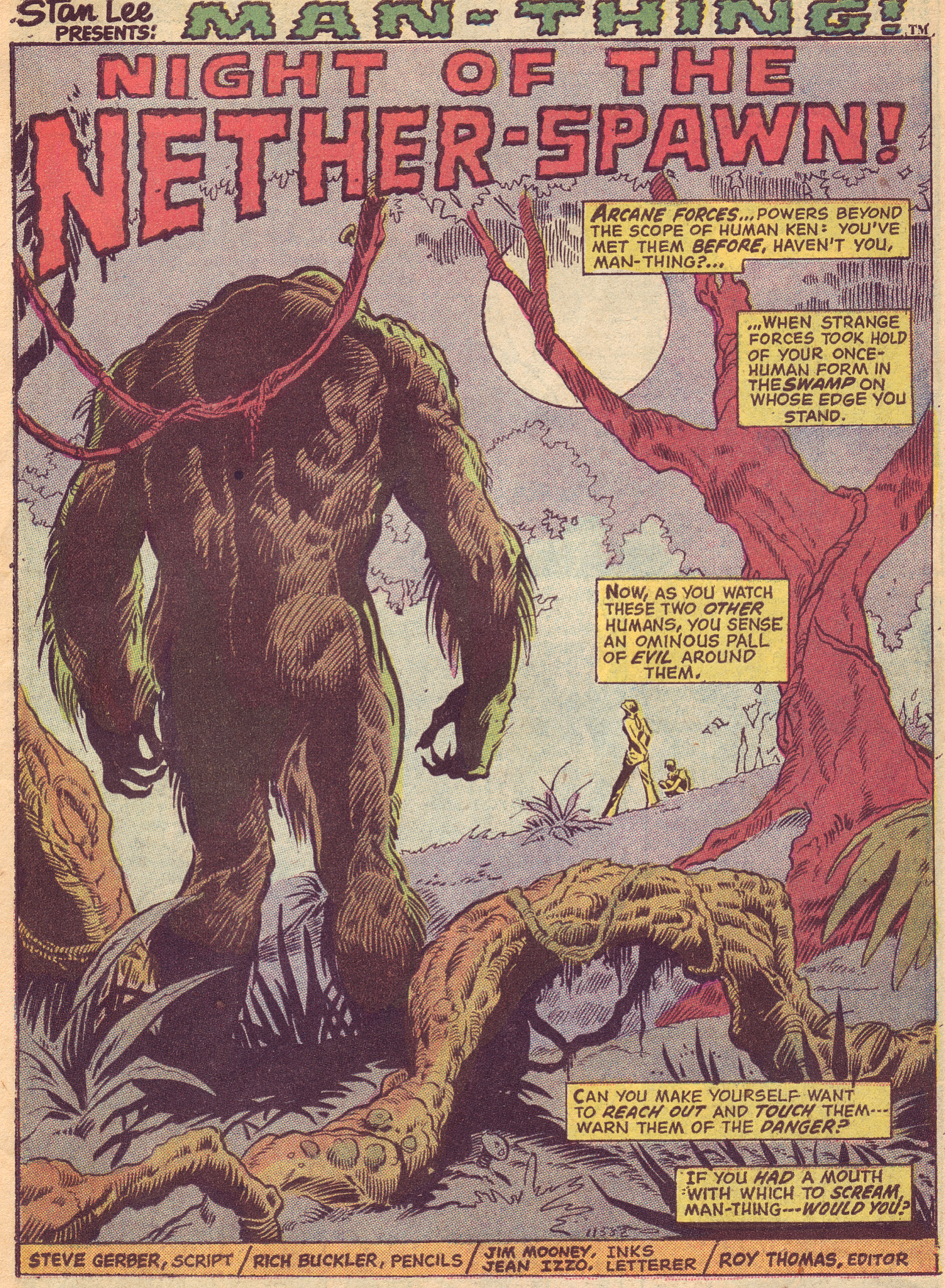 Marvel’s Man-Thing character starred in issues #10-19 of the title “Adventures into Fear” before getting his own book in 1974. I just finished reading those issues and I’m now starting on Man-Thing series one (1974). I thought I would share scans of two of my favorite covers from the Man-Thing Fear issues as well as some of the great interior art. As always click on the large “thumbnails” below to load much larger high resolutions versions. Enjoy!