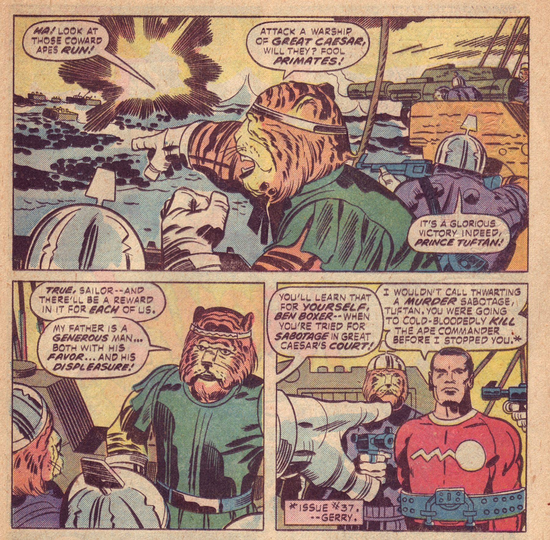 The above scan is from Kamandi #39 from 1976. The art is by Jack Kirby with inks and letters by Mike Royer. Unlike most of the issues that came before it this one is written by Gerry Conway rather than Kamandi’s creator Jack Kirby. I bring this gem up because I was recently smelling some old comicbooks….that’s right SMELLING them and at once I was reminded of my first taste of Kirby’s solo creations…..and quite possibly one of the first comics I ever read period. It’s really strange and wonderful the way certain smells can take you back to a certain moment in time. I worked with a guy that had little to NO SENSE of smell. It never seemed to bother him much. But it sure would bother me! As I I’ve mentioned before I LOVE the smell of pulpy book paper….comic paper being my favorite but old paperbacks being a close second (almost the same paper really). I remember buying this issue. I must have been about 8 years old since this was some time in the summer of 1976 (I think). I was with my parents at a fishing lake. Despite his best efforts my Dad couldn’t interest me much in fishing. Although I was somewhat interested in the big worms I was NOT too happy about skewering them on a hook! It was on a trip to the bait shop to get said worms when I discovered that Kamandi comic on a creaky wire-frame spinner rack. I talked my Dad into adding this 25 cent purchase to whatever the cost that container of worms was and we headed back to our spot at the lake. I didn’t spend too much time with the fishing rod after that as I was wrapped up in discovering a brand new crazy sci-fi fantasy world of Kirby creations! And I was hooked for life. It makes for a good story and that is how I remember it but it may or may not have been my very first comicbook.