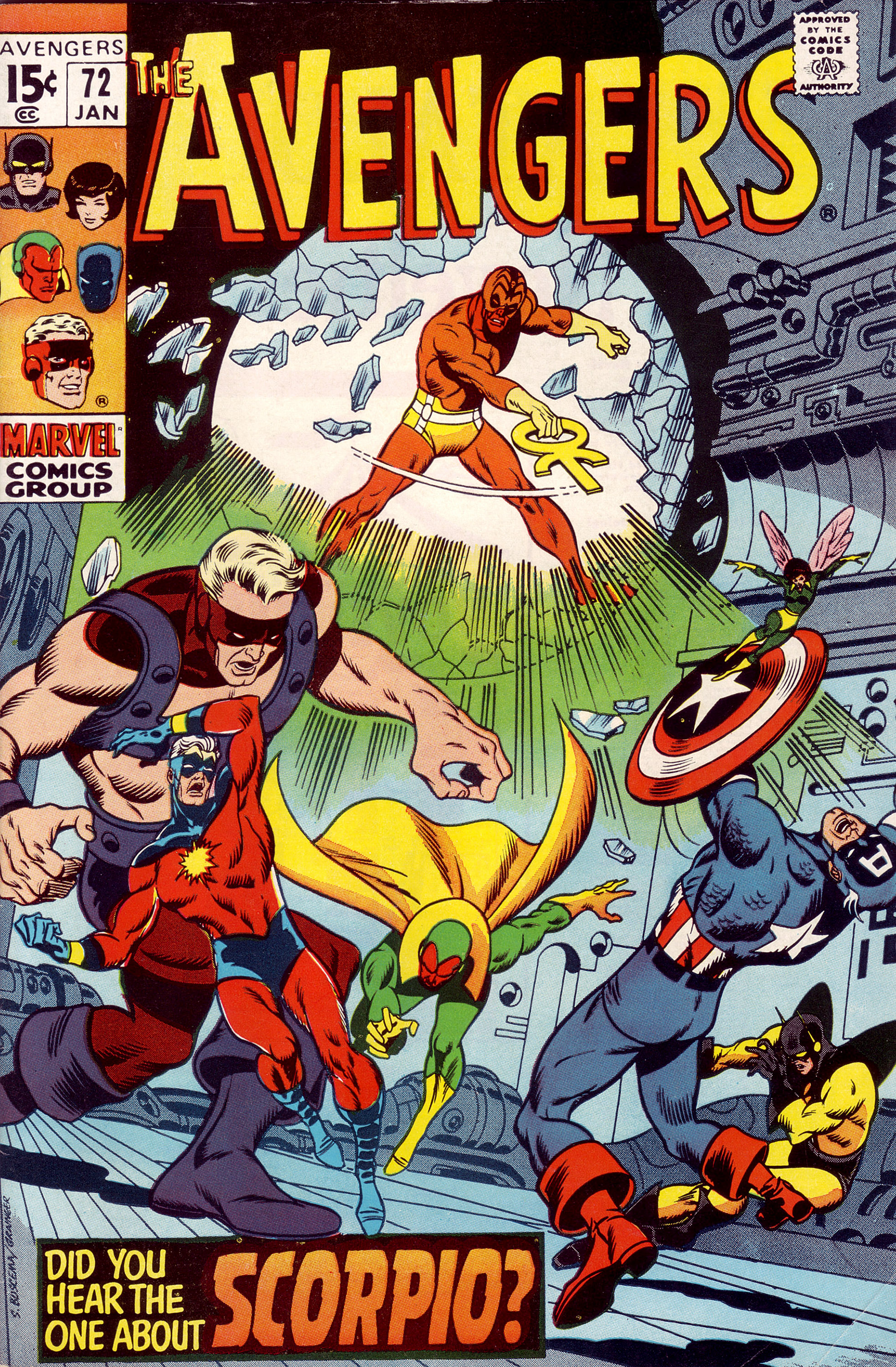 Time for the Sunday Scan! This week it’s Marvel’s Avengers #72 (1970). This colorful and dynamic cover is by the great Sal Buscema with inking by Sam Grainger. It features the psychedelic villain Scorpio. You don’t get much more late 60s/early seventies than this!