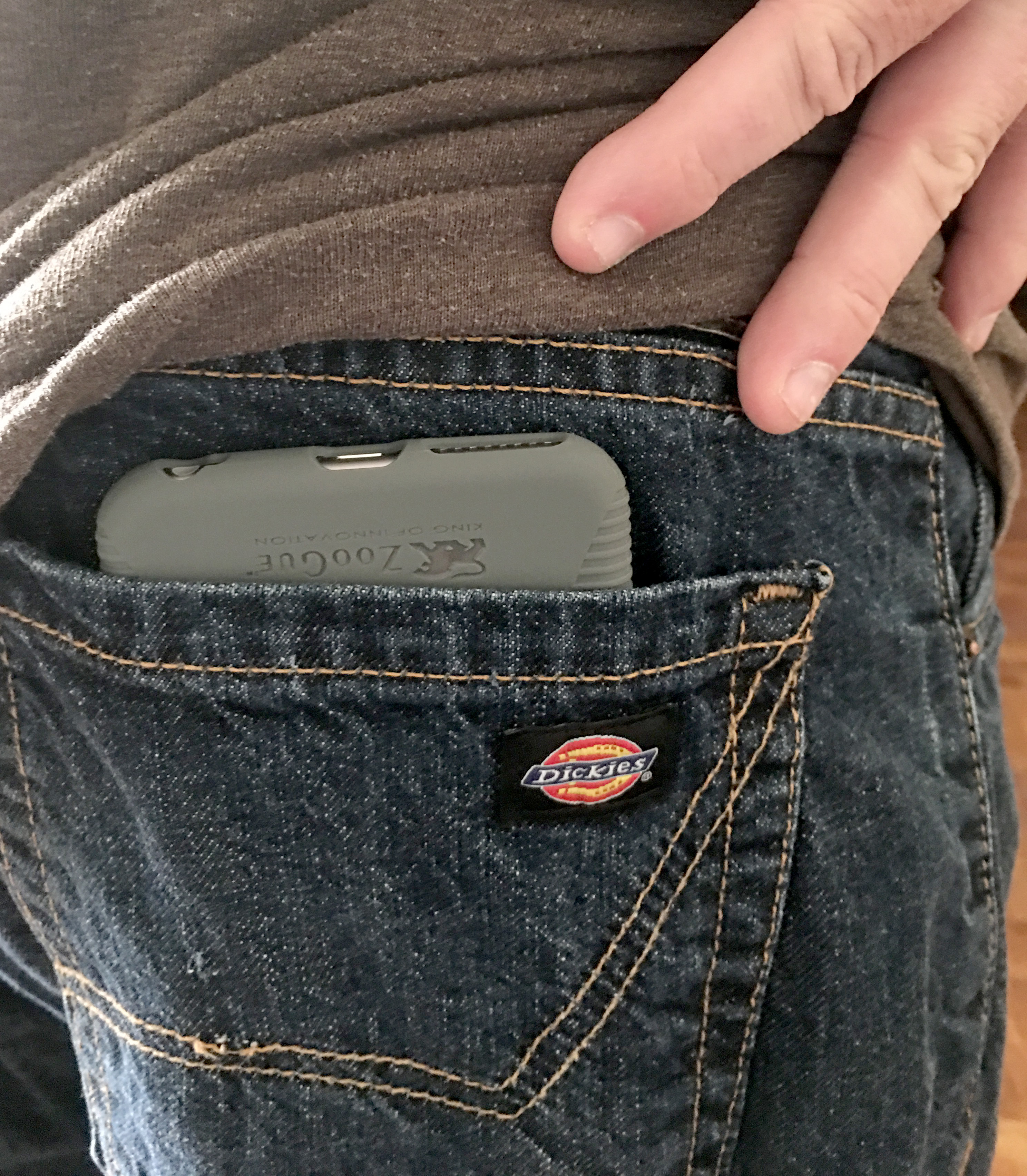 The pictures above compare and contrast my old iPhone 4s with my new 6s Plus. The 4s is wearing a Monoprice two piece case while the 6s Plus is sporting a ZooGue Social Pro one piece. Both have very similar grip lines on the sides that greatly improves handling especially on that of the somewhat slippery 6s Plus. When I first started carrying the big iPhone 6s Plus I had it wearing an UrbanArmorGear case. It was fine and it fit in all my pants pockets fairly well. I was totally satisfied with the UAG case until I handled my Wife’s 6s Plus that was clad in a ZooGue Social Pro. It felt about 100 times better! Although the UAG is NOT a big and bulky Otter-box like tank it did add a bit of width and length. It seems when you are dealing with something measured best in millimeters a “tiny bit” counts for a lot. I have short little hobbit fingers on short little hobbit hands but I have to say I can handle the big 6s Plus just fine especially with the very slim ZooGue case. It also fits in the pants pockets just a little better with the svelte case. See here: