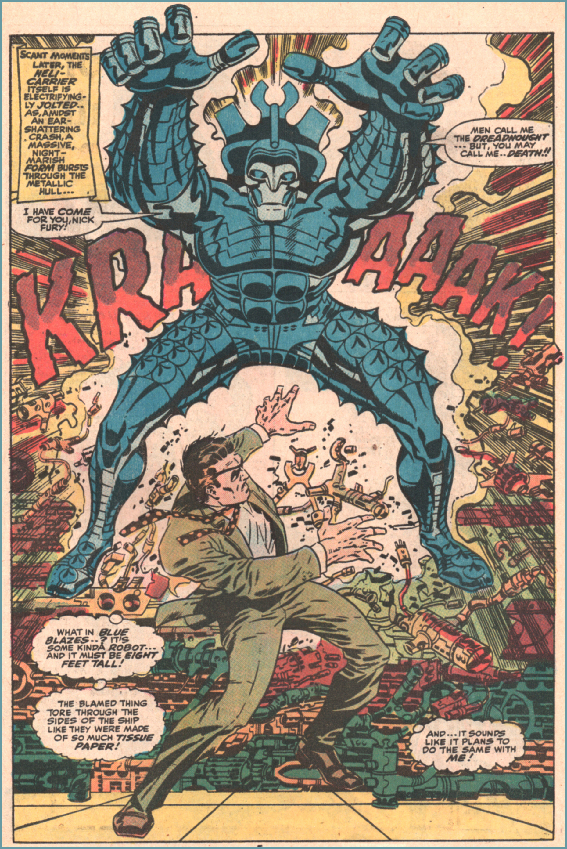 This week’s Sunday Scan features an explosive full page splash by the legendary Jim Steranko. This page is from Marvel’s Strange Tales #154 (1967). Story and art by Jim Steranko with a script by Roy Thomas. Click for higher resolution version.